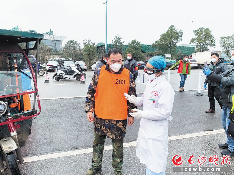 防疫人员在给湖北货车司机量体温。 长沙晚报通讯员 孙威 摄