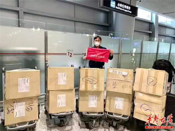 华声在线2月3日讯(记者 刘思佳)“1箱,2箱,3箱,……10箱,齐了!”1月31日下午3点半,在长沙黄花国际机场T2航站楼,导游孟亮经过防疫检查,抵达行李转盘前,清点着带回来的特殊“行李”,每个箱子上都标注了“湖南”的标签。在团友的帮助下,孟亮把这批物资推出机场,搬上货车,交给早在此等候的同事周智,运往武汉抗“疫”一线。