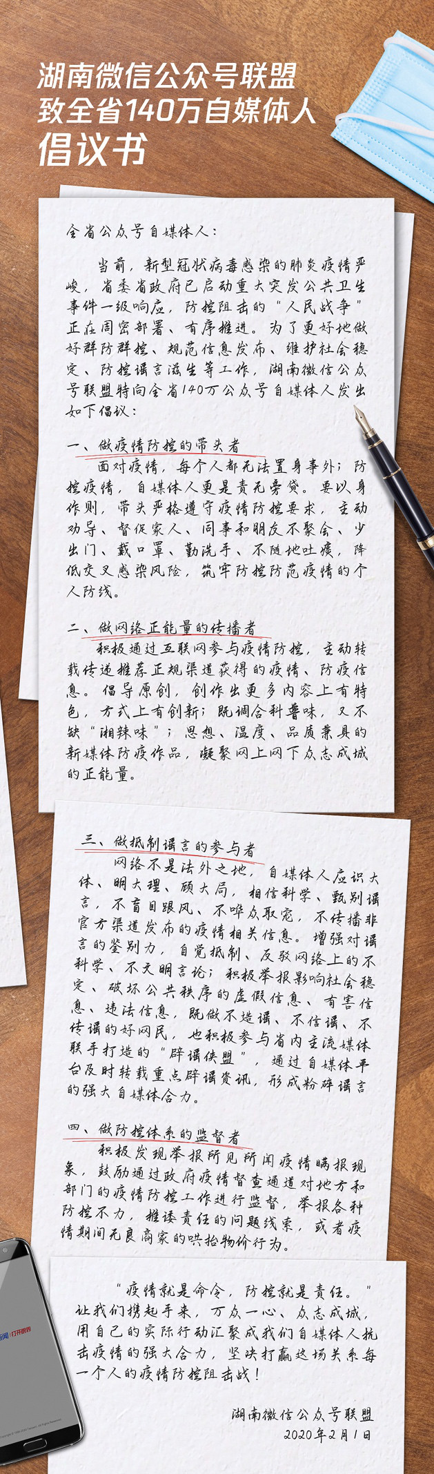 华声在线2月2日讯 今天,湖南微信公众号联盟向全省140万微信公众号自媒体人发出倡议书,倡议自媒体创作者万众一心,众志成城,做疫情防控的带头者、网络正能量的传播者、抵制谣言的参与者、防控体系的监督者,用自己的实际行动汇聚成自媒体人抗击疫情的强大合力,打赢这场关系每一个人的防控阻击战。