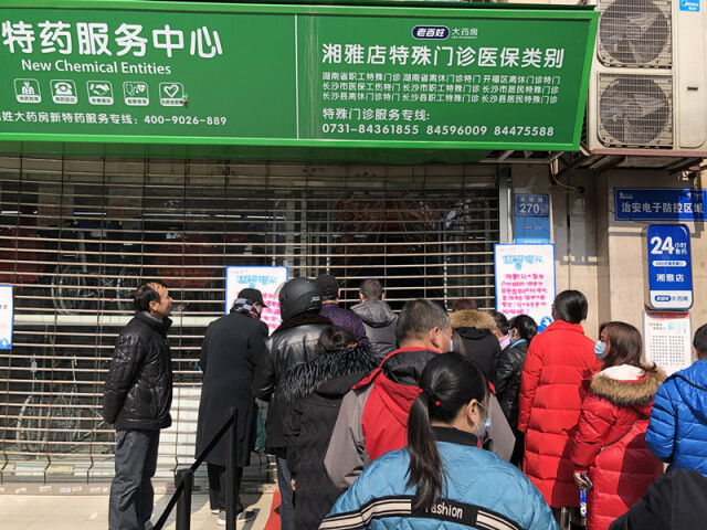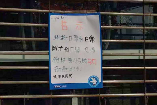 1月31日上午11时许,长沙市开福区湘雅路上的老百姓大药房,市民在有序排队购买口罩。药店贴出公告,每人可凭身份证购买3只。图 柳丽娜