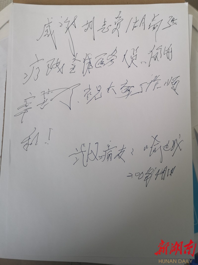 另一封感谢信只有几句话,写信的老人姓喻,老人除了患有重症新冠肺炎外,还有严重的尿毒症、心衰、偏瘫,目前仍处于插管状态,右手甚至连抬起来的力气都没有。当听说刘志勇和队友们明天就要离开的消息后,无论如何都要写几句话,表示感谢和祝福。“写字时,他的手颤颤抖抖,呼吸都很困难,可老人家非要坚持写!”刘志勇表示,劝都劝不住,看着老人抱病认真书写的样子,在场的医护人员无不为之动容。