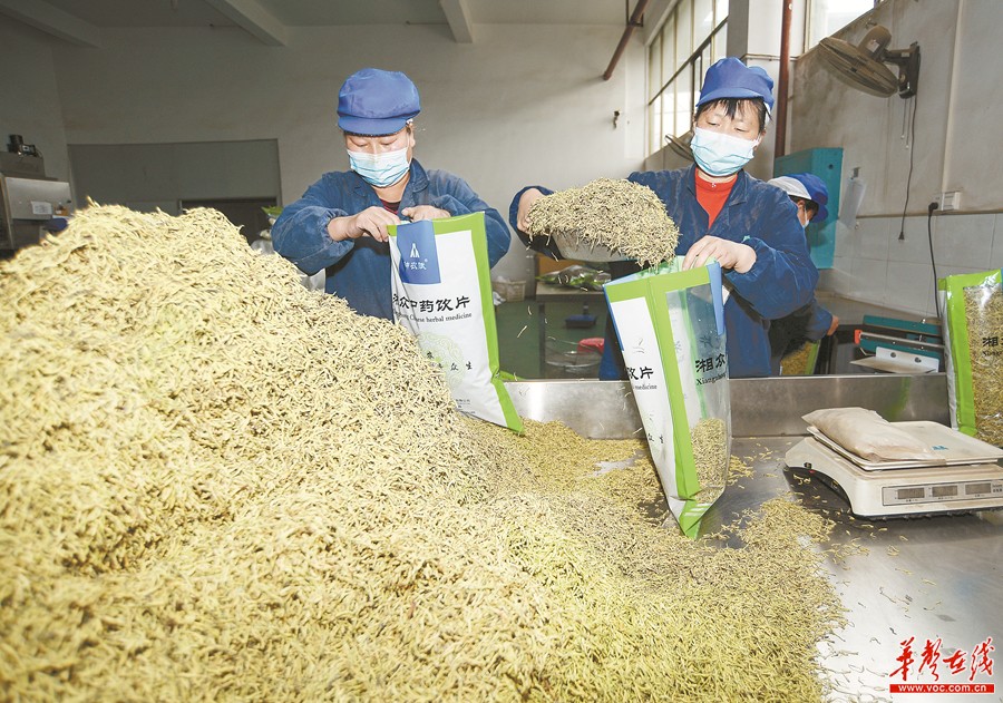 3月25日,安仁县华夏湘众药业工人在生产中药饮片屠苏茶。为确保防疫用药供应,该公司按照有关流程提前复工复产,加速生产中药饮片,全力支持疫情防控工作。