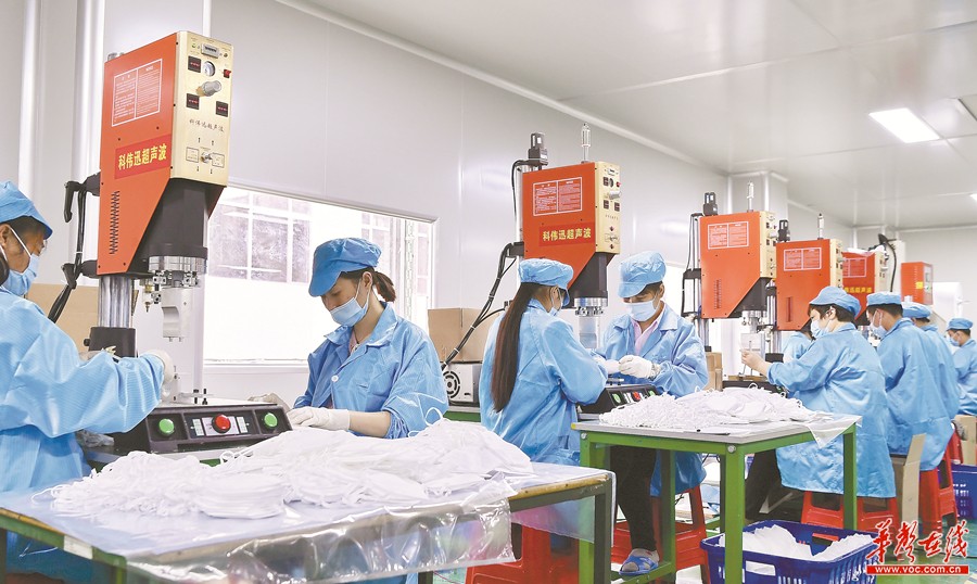 3月26日,永兴经济开发区郴州源丰光彩科技有限公司,工人在加紧生产口罩。该公司于今年2月上马口罩生产线,目前KN95防护口罩日产能3万只,一次性医用口罩日产能30万只。KN95口罩主要销往欧美国家,生产订单已排到了5月份。湖南日报·华声在线记者 童迪 摄
