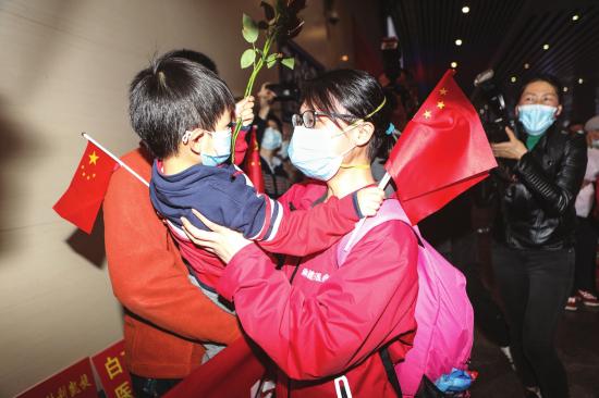 16 点 14 分,出站口一阵骚动。" 是妈妈吗?" 得到否定的答复后,小熊继续在爸爸怀里张望。16 点 15 分,邵阳医疗队率先走出来,响起了热烈的掌声和呼喊声。" 欢迎回家!" 小熊也伸着脖子朝着人群大声喊着。