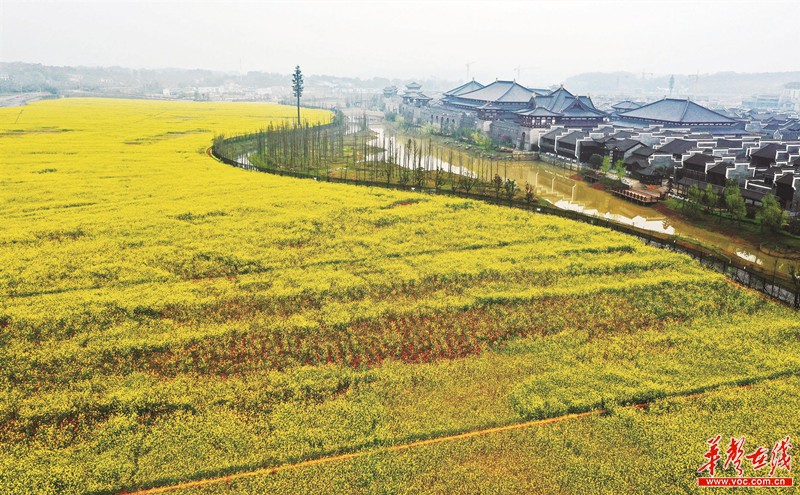 3月17日,长沙市望城区新华联铜官窑古镇周边的油菜陆续开花,成片的金黄色花朵与古镇盛唐风格建筑群构成一幅美丽的春日画卷。