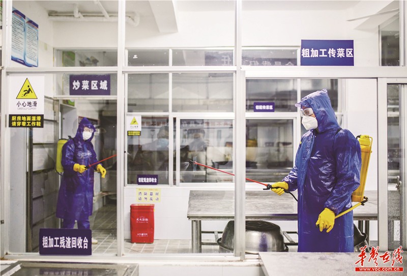 3月17日,永州市零陵区徐家井小学,学校防疫人员在厨房进行消毒。连日来,该校组织教师对学校教室、走廊、食堂、楼梯间等公共区域进行集中清洁消毒,不留死角,并对班主任老师进行疫情防控措施、知识技能培训和线上心理咨询辅导等工作,织牢疫情防护网,确保抗疫保学两不误。 潘爱民 摄