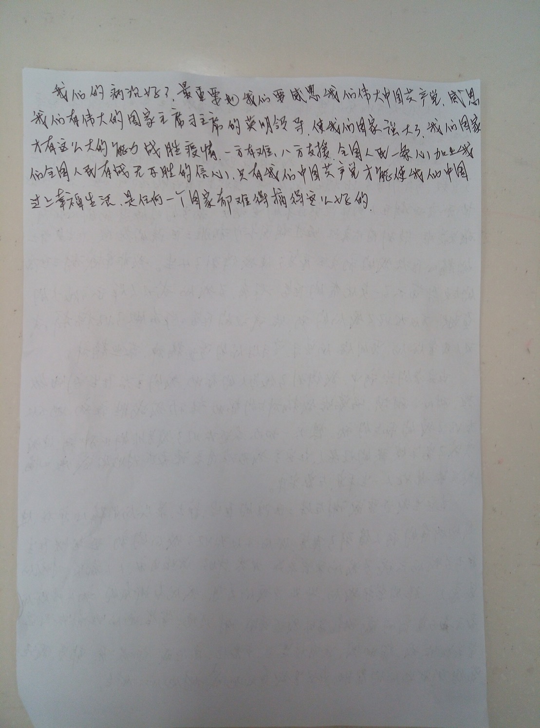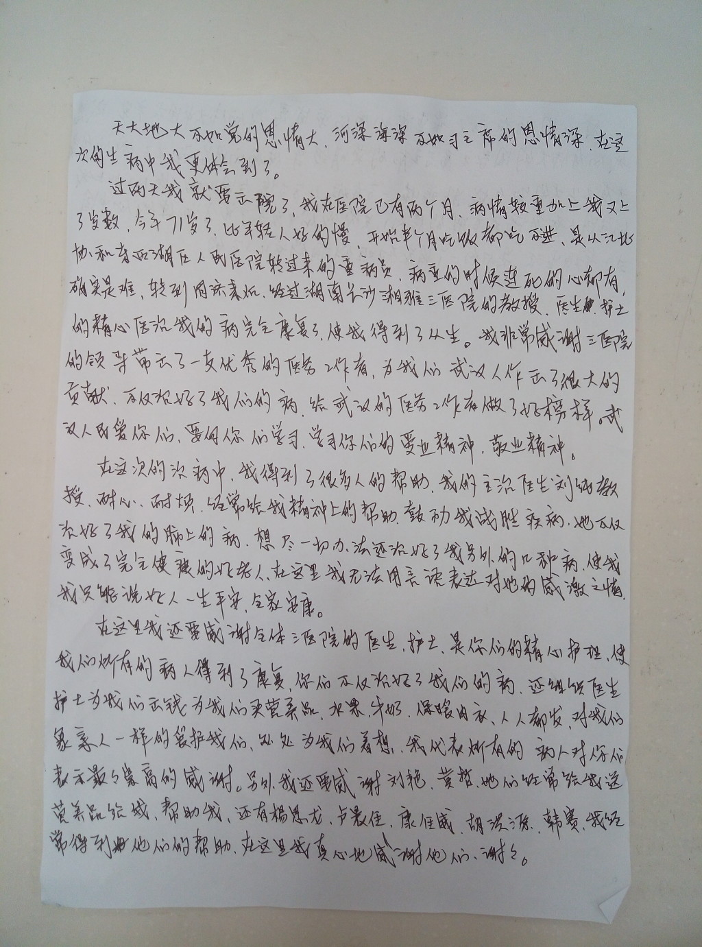 “等我出院了,我一定要带着我的儿女去湘雅三医院找你,看看你一层层防护服下的真面目。”3月17日上午,中南大学湘雅三医院支援武汉华中科技大学同济医院中法新城院区的医护人员收到了71岁新冠肺炎患者张爷爷的手写感谢信。