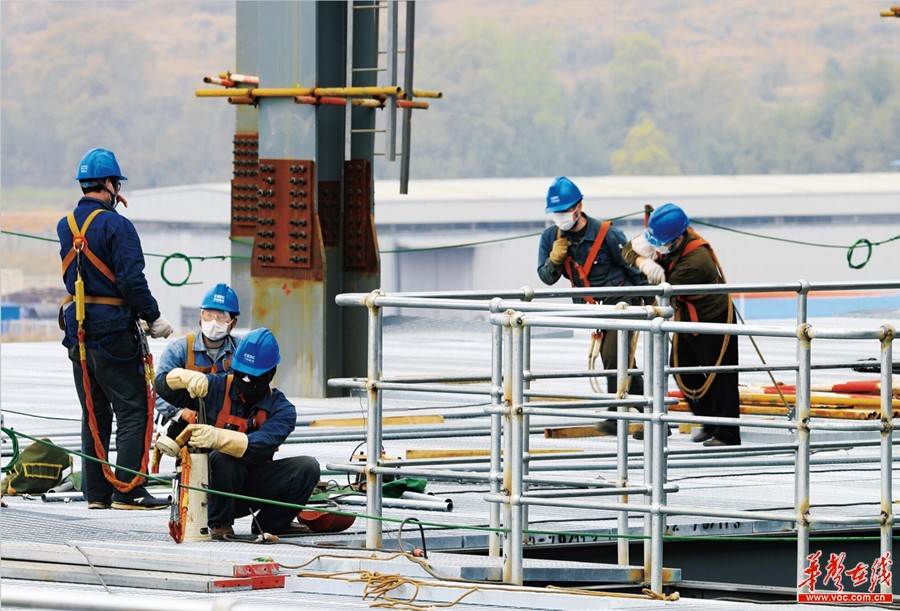 3月15日,东安县芦洪市镇,国华永州电厂一期工程建设现场一派繁忙。该工程是湖南省重点工程。东安县通过组团包车帮助施工人员返岗、督导疫情防控、提供物资保障等措施,帮助电厂建设于2月20日复工。目前,主厂房、集控楼、侧煤仓结构结顶等建设进展有序。严洁 摄