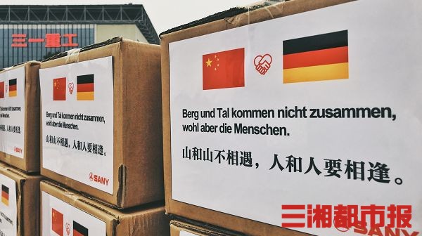 华声在线3月14日讯(湖南日报·华声在线记者 胡锐)记者今日获悉,三一集团向德国捐赠的首批50000个医用级防护口罩,于3月13日下午从长沙产业园发出。在捐赠包装箱上,印有一句德国谚语:“Berg und Tal kommen nicht zusammen, wohl aber die Menschen. 山和山不相遇,人和人要相逢”。