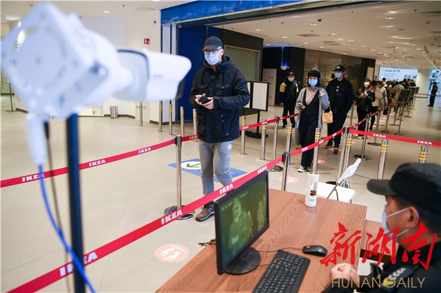 带好口罩、登记、测温……上午10时整,宜家长沙商场开门营业,在入口和车库间隔排队等候的顾客们,在工作人员指引下有序进入商场。