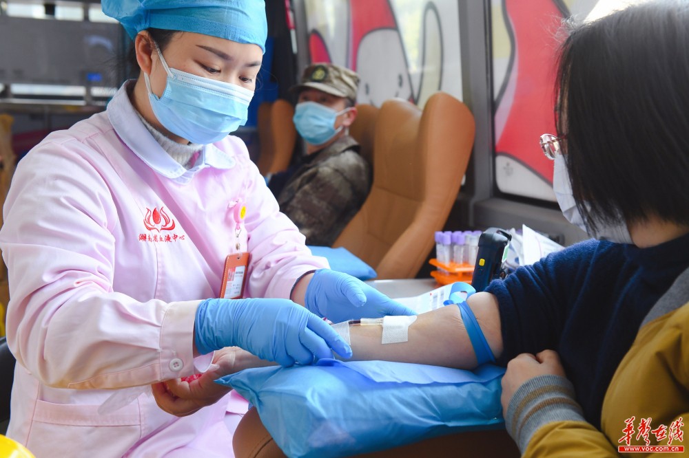 3月10日,志愿者在参加义务献血。当天,长沙市开福区四方坪街道开展“抗疫情、捐热血”志愿服务活动,辖区党员群众、退役军人120余人参加,助力打赢疫情阻击战。