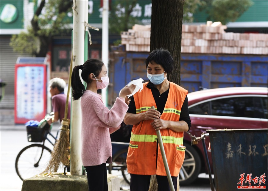 3月8日,嘉禾县晋屏大道,一位50多岁的环卫工人正在街头清扫树叶,一名小朋友来到她的面前,轻轻地为她擦去脸上汗水。据了解,小朋友是住在附近的一名5年级学生,与环卫工人互不相识,她平时在学校受到感恩教育的启发,做出了刚才的暖心举动。黄春涛 摄