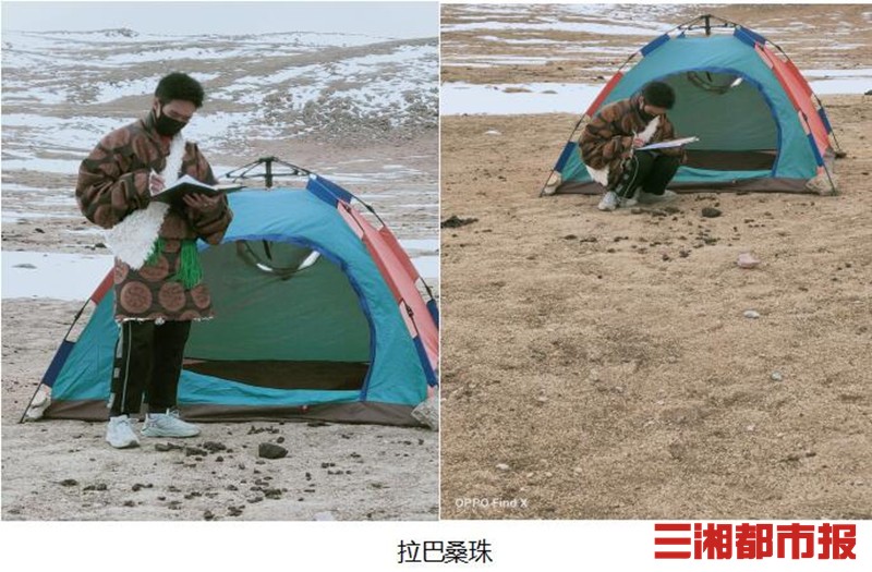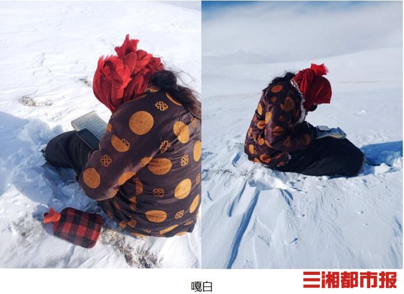 和拉巴桑珠一样,嘎白也来自西藏那曲,在平均海拔4800多米的雪域高原,她身穿藏服,盘坐在雪地里埋头学习,一条红围巾把头严实地包裹起来,身旁的热水袋已无暇顾及。“我们不远千里奔走他方去学习知识,不能因为新冠肺炎疫情就中断学习,老师辛苦地为我们做在线教学,我们怎么能够谈苦,谈累呢!”嘎白说,高原网络信号弱,有信号的山头离她有两个多小时的步行路程,所以为了完成学习任务,她每天早上五点多就必须起床,并且在雪地一待就是四个小时,天气很冷,浑身被冻得僵硬,但她还是乐在其中。“我们雪域高原的孩子,自身都有一股子倔劲头。”
