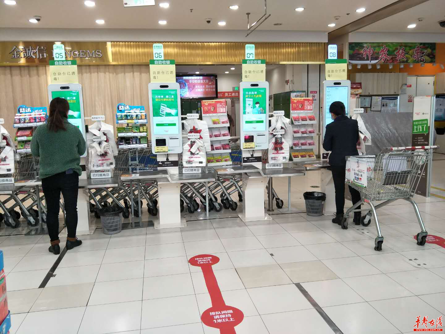 在超市,收银区红色的“一米线”格外醒目,在超市广播和“一米线”的引导下,超市鼓励顾客有序地走上自助收银通道,以“无人超市”的零接触模式,让顾客放心消费。