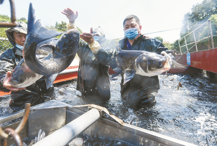4月29日,渔民在捕捞大雄鱼。“五一”国际劳动节前夕,湘菜剁椒鱼头食材产地之一的岳阳县铁山水库雄鱼大丰收。杨华峰 摄