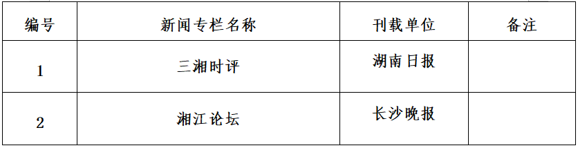 根据中国记协《关于第三十届中国新闻奖报送工作的通知》和中国新闻报纸副刊研究会《关于开展第三十届中国新闻奖报纸、通讯社新闻专栏作品初评工作的通知》要求,湖南省新闻工作者协会委托省记协报纸副刊分会组织专家评审,拟推荐2件报纸新闻专栏作品(目录见附件)参评第三十届中国新闻奖初评,现予公示。