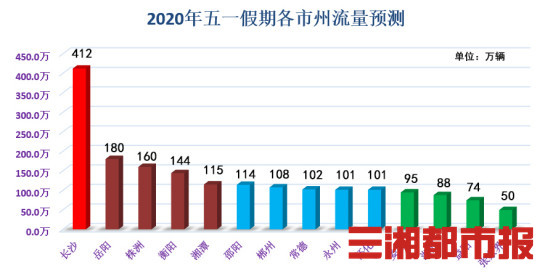 预计2020年“五一”假期将迎来省内中短途自驾出游高峰,全省高速公路路网车流总量居高位运行,且客货混合车流叠加,路网保畅压力较大。预测省内高速主要区间路段、热点景区邻近路段、长株潭城市群周边路段流量压力会骤增,长沙、岳阳、株洲、衡阳、湘潭辖区高速收费站总流量或成为今年“五一”假期排在全省各市州辖区高速收费站的车流量的前5位。