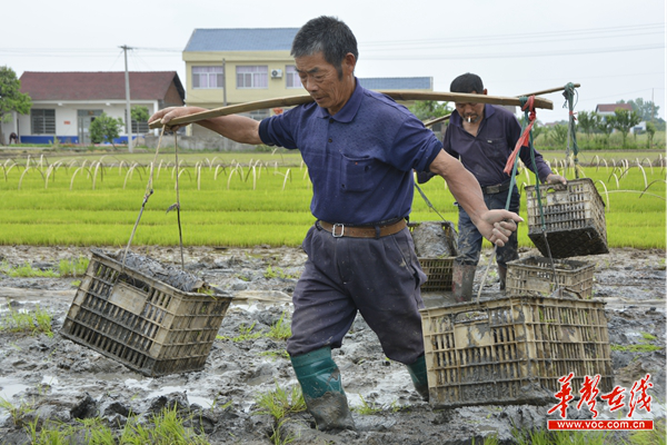 (村民在起运早稻秧苗,运送到种植户稻田边上。记者 赖泳源 摄)