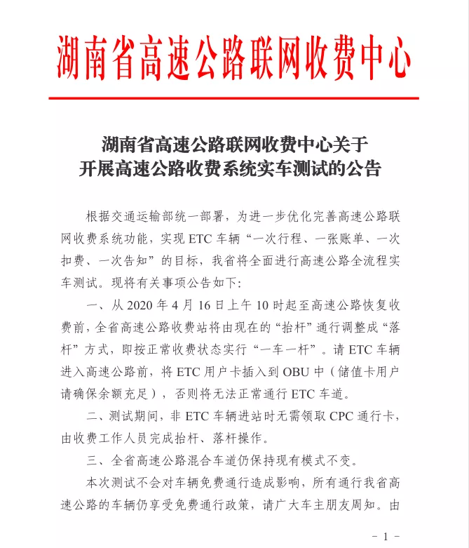 4月15日,湖南省高速公路联网收费中心发布公告:16日10时起,湖南将启动全省高速公路收费系统优化完善实车测试,车辆通行收费站恢复至“一车一杆”模式。