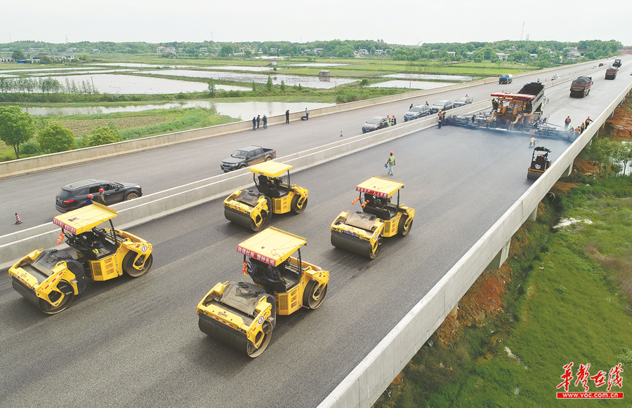 4月14日,长益高速扩容工程宁乡市王家湾大桥段,工人在进行沥青摊铺施工。目前,该工程项目部抢抓晴好天气加快施工,路面工程已完成68%,交安、房建、机电等后续工程正有序推进,全线有望于8月底通车。