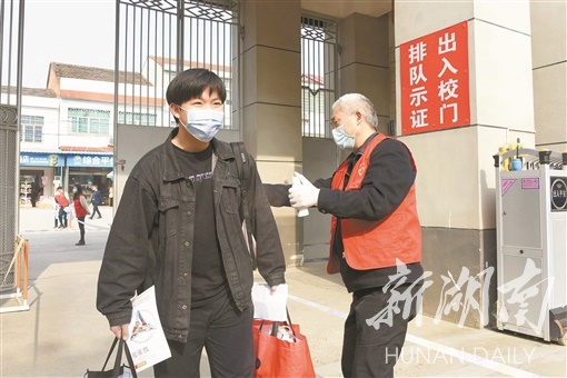 4月7日,高三学生酒精消毒洗手、测量体温后进入学校。衡阳市各级各类学校实行分类错峰复学,其中第一批返校的高三、初三年级学校于当天正式开学。 罗茂盟 摄