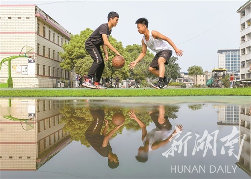 4月7日,道县第二中学,返校学生在打篮球。该县各学校制定了科学的复课管理方案,采取有效工作措施,确保学生安全返校上课。 蒋克青 摄