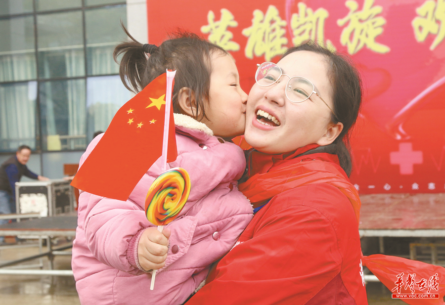 4月6日,宁远县人民医院,支援湖北医疗队队员李芳幸福享受女儿的亲吻。当天,该县4名支援湖北医疗队队员在隔离休整期满后返回单位,受到热烈欢迎。李萍 刘黎英 摄影报道