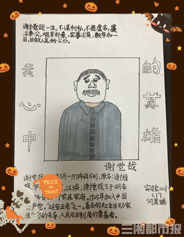 “祖国如今的繁荣富强,我们有现在的幸福快乐生活,都离不开英烈们的奉献和牺牲。”宁乡市玉潭街道大街岭小学六年级学生龙梦璇画的是中国共产党创始人之一、无产阶级革命家何叔衡。