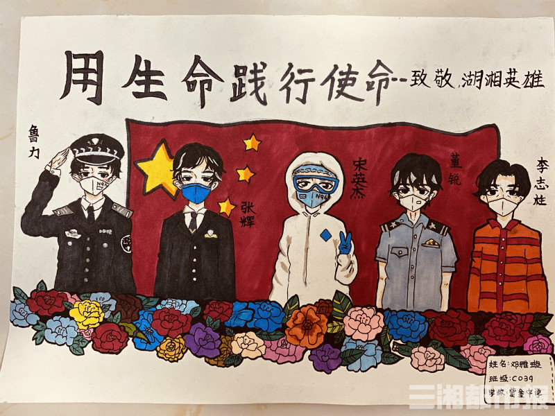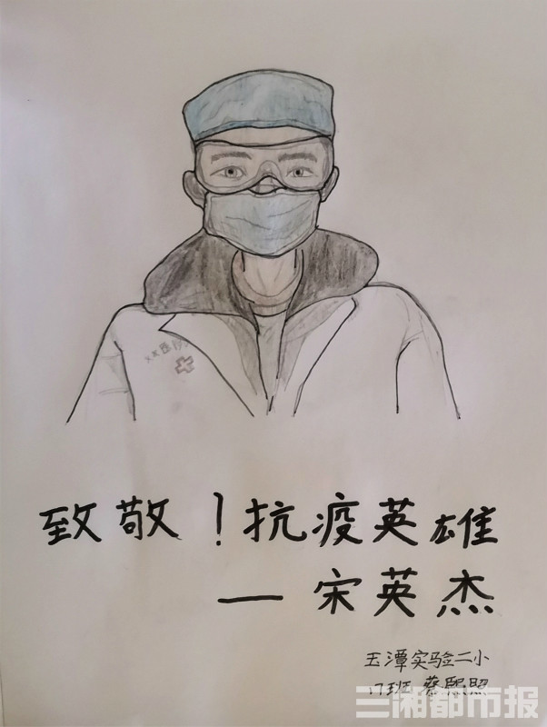 白马桥街道滨江小学五年级学生苏俊羽说,自己心中的英雄是为抗击新冠疫情肺炎疫情作出了巨大贡献的医护人员们,前段时间他还录制了一首单曲《你的模样》致敬医护人员,这次画的也是医护人员。“虽然他们戴着口罩看不清他们的模样,但他们那双熠熠闪烁的眼睛和坚定的眼神,时刻都浮现在我的脑海里。我想对他们说,谢谢你们白衣天使,你们为患者抢救生命,感谢你们白衣天使,你们为春天送去温暖,感激你们白衣天使,你们为中国创造奇迹,向英雄致敬。”