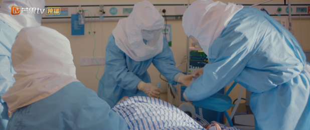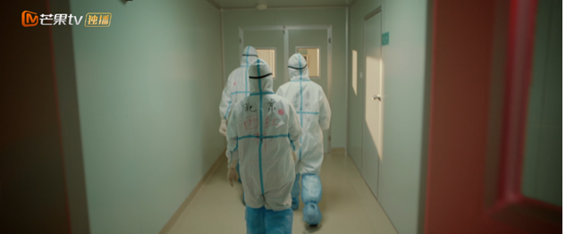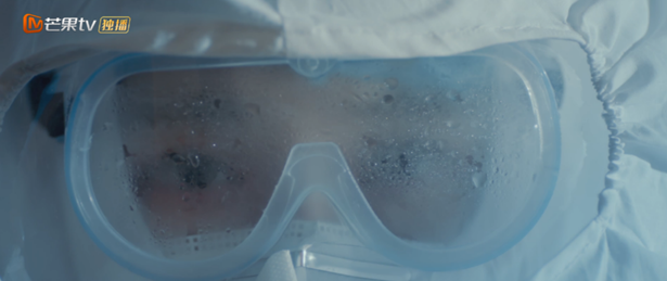 拍摄中,演员们每隔2分钟就得把面罩拿开透气,最长的一场戏拍了10分钟,许多人已经大汗淋漓喘不过气。而在湖北战场、武汉战场上,医护人员在防护服中一待就是4个小时以上,手长时间戴手套导致发胀,脸被口罩压皱,护目镜被雾气和汗水浸透……