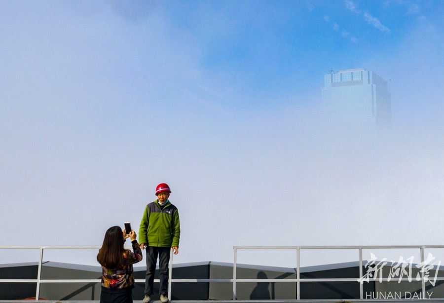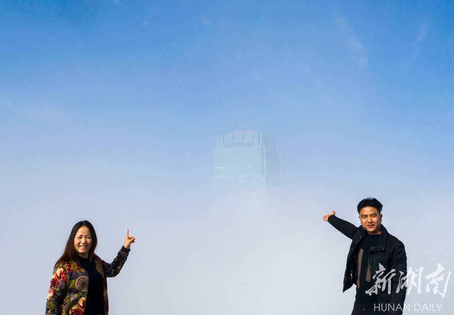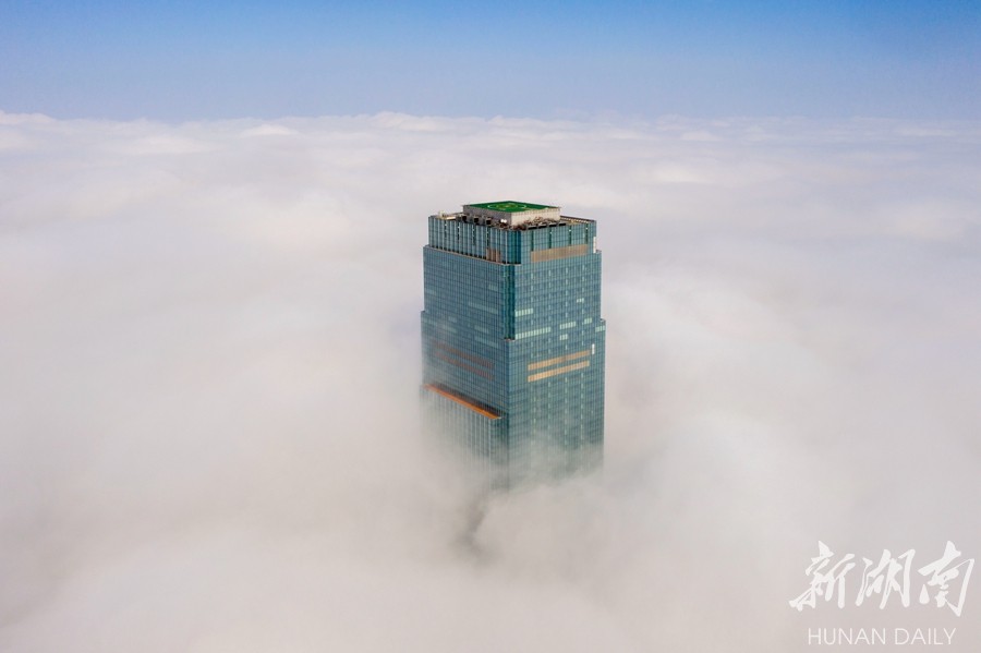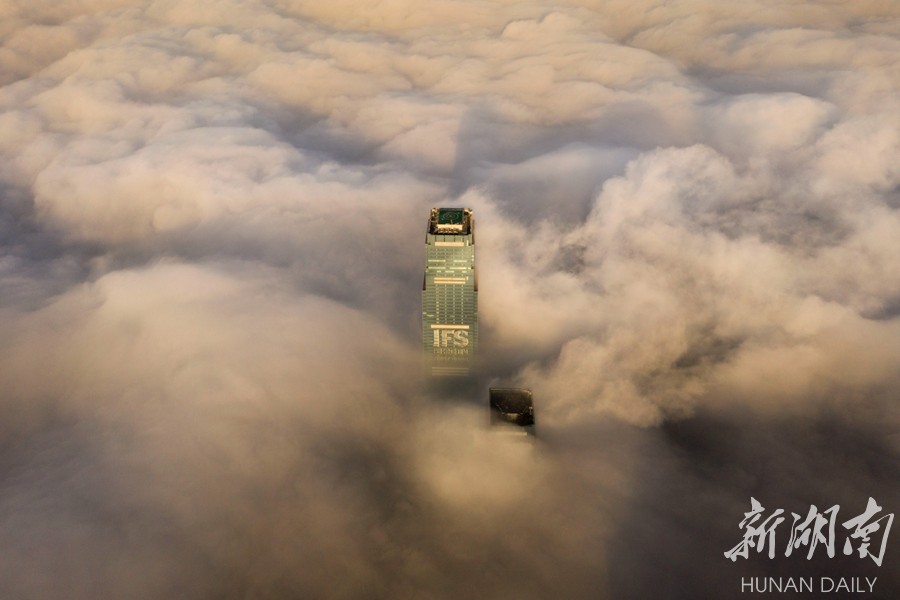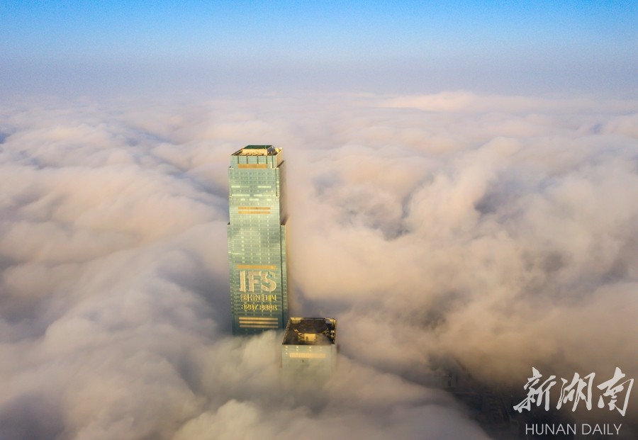 4月1日清晨,长沙市城区大雾弥漫,地标高层建筑IFS穿云而出,十分壮美。湖南日报·华声在线记者 唐俊 摄