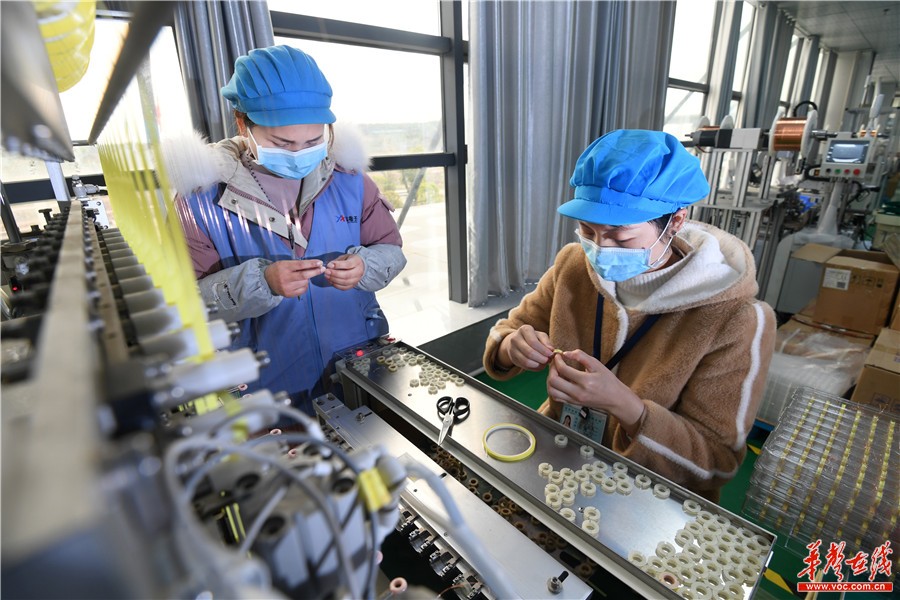 3月31日,怀化亚信电子有限公司生产车间,工人在检查绕线机线圈生产质量。春节后,该公司在怀化经开区管委会定点帮扶下,做到疫情防控及复工复产两不误,目前在手订单比去年同期增长20%,电子产品节后新增订货100万个,预计新增产值1000万元。 湖南日报·华声在线记者 田超 通讯员 彭文文 摄影报道