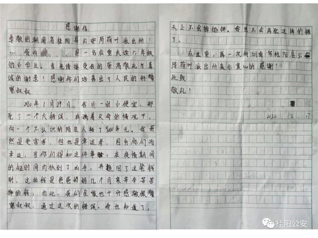 潇湘晨报郴州讯 "我是受害者,也是幸运者,因为你们而幸运。"5 月 24 日,桂阳县公安局荷叶派出所民警收到一份从四川攀枝花寄来的快递。很少网购的民警经再三确认打开包裹后,才得知里面是一面大红锦旗和手写的感谢信。