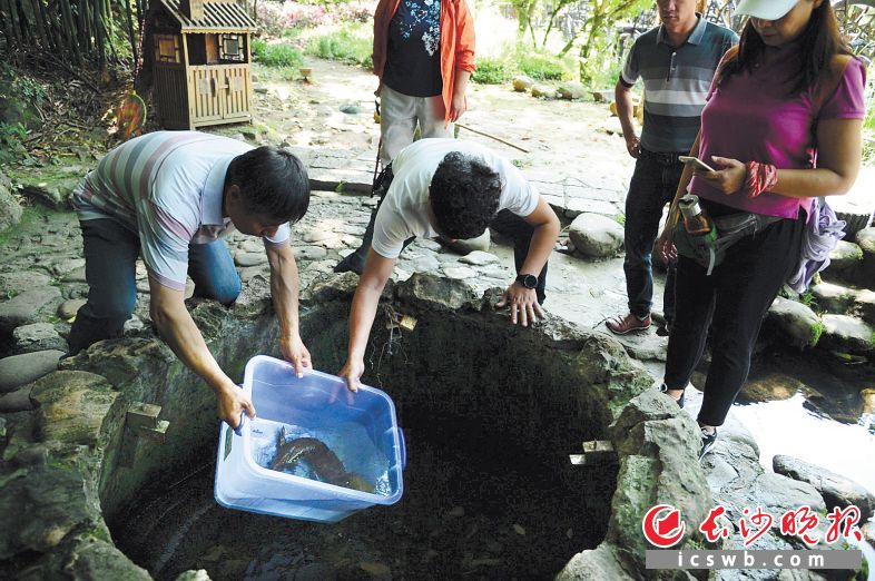 5月23日,樊先生与黄龙洞景区负责人放流娃娃鱼。均为长沙晚报通讯员 邓道理 摄