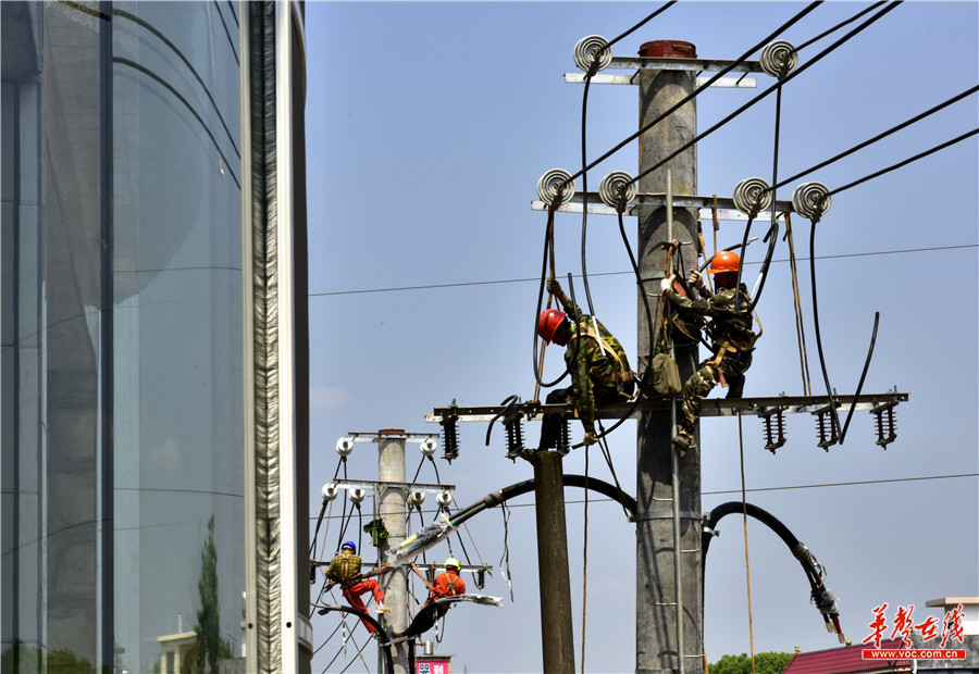 5月12日,蓝山县楠市镇10千伏楠楠线,工人在进行线路安装。连日来,国网蓝山县供电公司组织开展供电线路金具安装、展放导线、隐患消缺等作业,推进农村电网改造,提升供电可靠性,迎接夏季用电高峰。