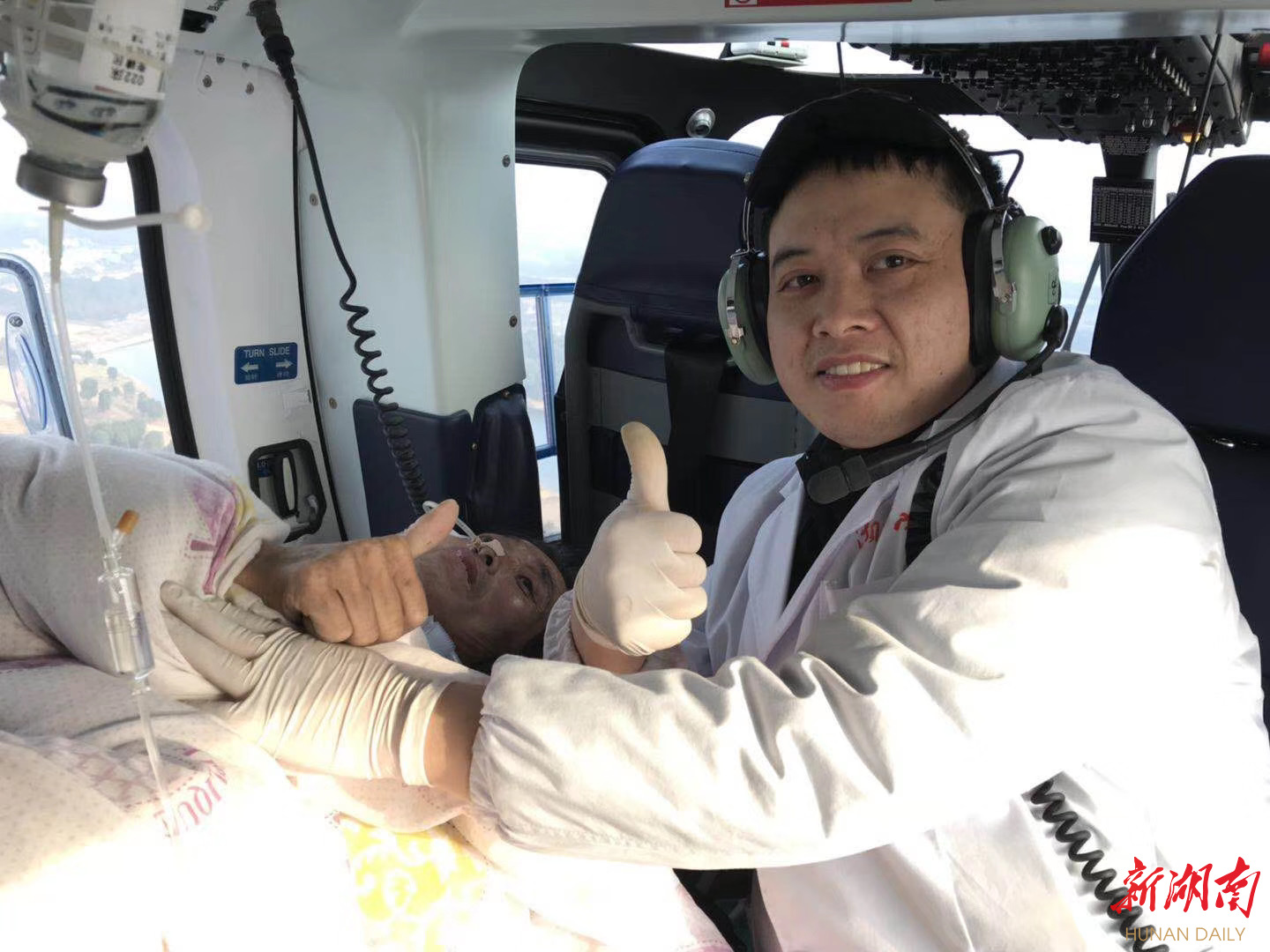 印象最深的一次,是去醴陵接一位从高处坠落多处骨折的病人。进行空中救援时,飞机上只有一位医生与一位护士执行医疗任务。因地形限制,直升机停机处离病人所在的医院有一段车程。这位病人本身体重160斤以上,身上插了七八根管子,当地医院为转运病人准备的是手术室使用的麻醉呼吸机,和他们之前沟通的便携呼吸机相差甚远。“我一看傻眼了,他们的呼吸机就像平常用的双开门冰箱那么大,而我们只有两个人。”李祖亮回想起当时的场景,感叹不已。