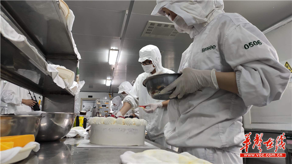在裱花车间,40多名工人分早晚两班滚动工作,“早班6点到1点,晚班2点到晚上10点,半个月对调一次。”张朕和同事们通力配合,生产各种款式的西点、蛋糕和面包,最大的蛋糕有20寸。