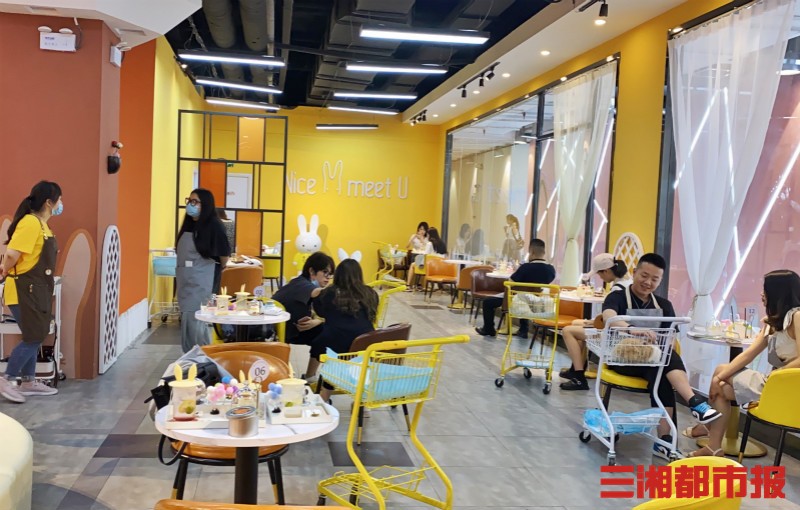 三湘都市报记者注意到,消费者进店得先洗手消毒,再围上一件防粘毛围裙。入口处不仅搭建一个黄橙色为主的拍照区,店内还准备了可爱的兔耳朵头饰,供顾客与萌兔合影;兔元素的甜品、杯盖、头饰充满了整间店面,让人仿佛置身于爱丽丝仙境的兔子洞。