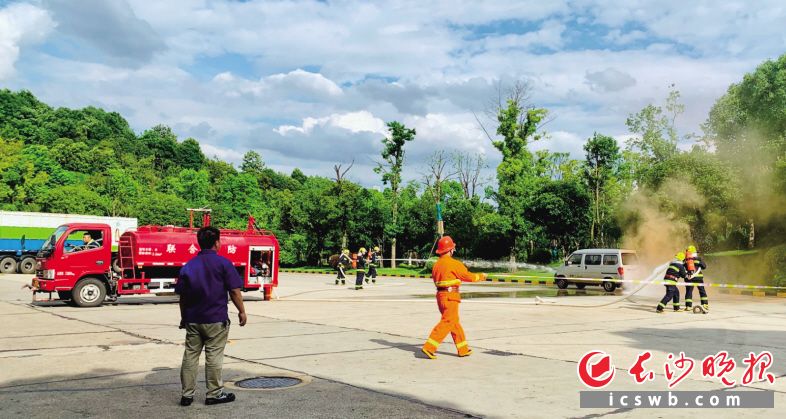 联合餐厨垃圾转运车队随车配备消防应急救援设备,并配备消防车,21日现场演练消防应急救援。长沙晚报通讯员 罗咏梅 摄