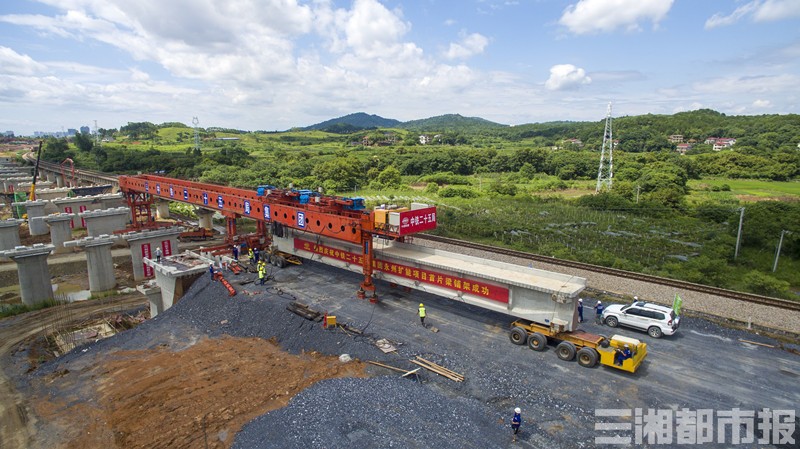 华声在线6月18日讯(三湘都市报·华声在线记者 陈月红 通讯员 向雅斯)今天下午5时,在永州市冷水滩区马坪村,随着架桥机将首榀长32.6米、重134.3吨的T梁缓缓架设在芦洪江双线大桥桥墩上,由中铁二十五局承建的湘桂永州扩能I标项目顺利架设首片T梁,标志着整个项目进入桥梁上部结构施工。据悉,湘桂铁路永州扩能工程计划明年3月通车,将实现铁路客运和货运分离,有助于缩短湘桂线永州段运行时间。