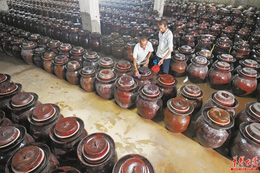 6月16日,永州市冷水滩区牛角坝镇麦子园村泡菜厂,员工在检查泡菜生产情况。近年,在市政府办驻村工作队的扶持下,该村规模发展泡菜产业,带动了75户贫困户直接或间接受益。