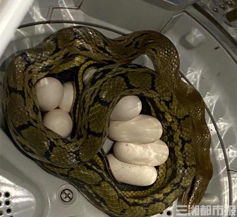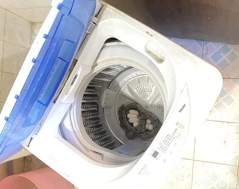 6月17日,湘潭韶山市银田镇的谢女士家中经历了这样的惊险一幕,一条2米长的大蛇竟然在自家洗衣机里产了一窝蛇蛋。