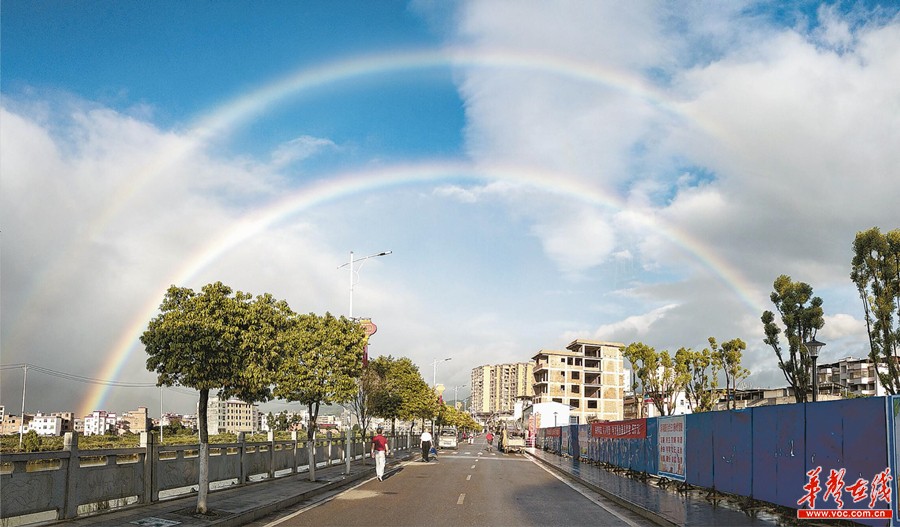 6月15日早晨,蓝山县沿河风光带,天空中出现双彩虹美景。双彩虹是光线在水滴内进行两次反射后形成的特殊现象。曾东林 摄