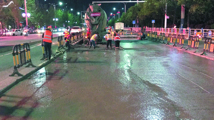 湖天南路项目施工总指挥谭炎坤介绍:在疫情结束后,项目部把红星南路基础重做工程完工后,又紧锣密鼓推进了湖天南路的施工,湖天南路施工总面积850平方米,现在正值梅雨季节项目部抢抓进度,半个月基本完工。