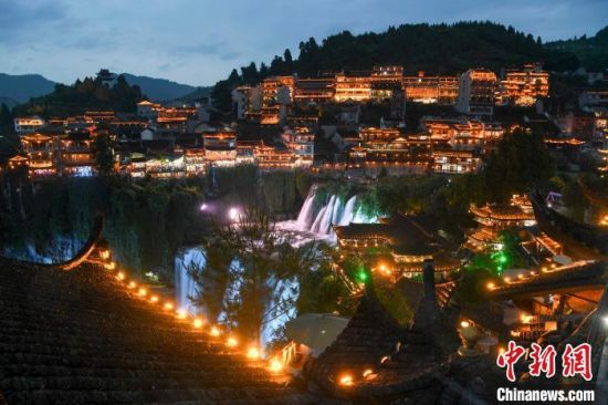 6月11日,位于湖南湘西永顺县的芙蓉镇的瀑布在夜空下变换着各种颜色。这座被称为"挂在瀑布上的千年古镇",因其绝美的自然景色,成为新晋“网红”打卡地。古镇内的瀑布是湘西最大、最壮观的一道瀑布,高60米、宽40米,分两级从悬崖上倾泄而下,在灯光的照射下,“会变色”的芙蓉镇瀑布绝美异常。 杨华峰 摄