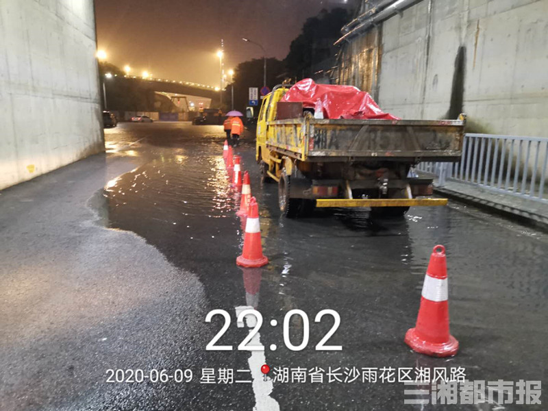 强降水导致雨花区香樟路武广铁路桥下,树木岭路自然岭路口,万家丽绕城高速桥下,香樟路圭塘路口,湘府路圭塘路口等20余处严重积水,影响通行。