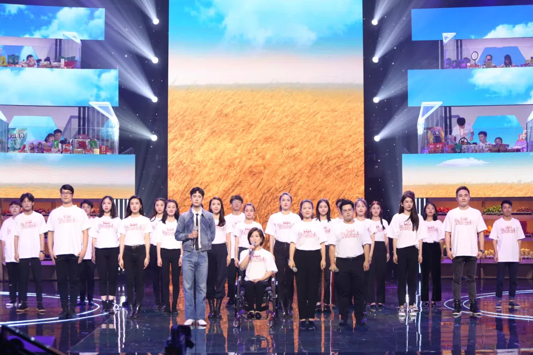 主舞台上,天天兄弟(主持人)负责整场直播内容把控,推荐人(扶贫产品代表)在电视大屏进行产品推荐,下单助力官(艺人嘉宾)进行带货PK;