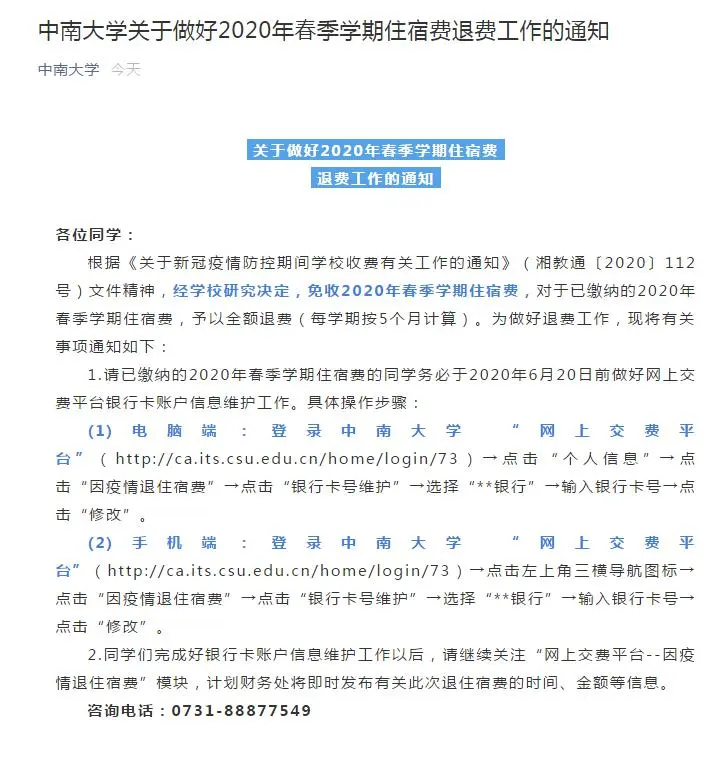 6 月 9 日,中南大学在官方公众号发布了《 关于做好 2020 年春季学期住宿费 退费工作的通知 》,通知称,经学校研究决定,免收 2020 年春季学期住宿费,对于已缴纳的 2020 年春季学期住宿费,予以全额退费。