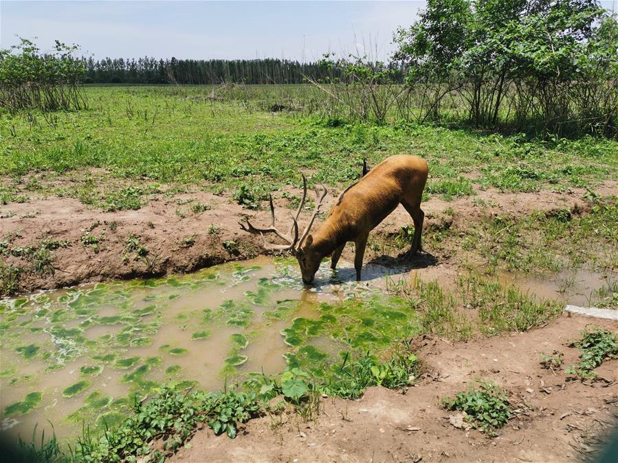 在东洞庭湖麋鹿和鸟类救助避难中心,一只雄性麋鹿在池塘里喝水(5月26日手机拍摄)。 新华社发(王昕怡摄)