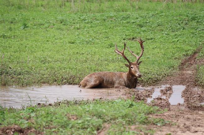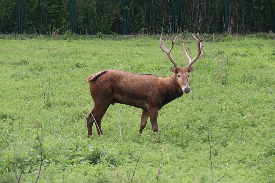 这是5月26日在东洞庭湖麋鹿和鸟类救助避难中心拍摄的一只雄性麋鹿。新华社发(蔡潇潇摄)